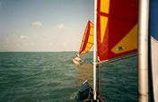 "Here are some pics of VIKEA, our cutom-built catamaran/kayak.....the sails